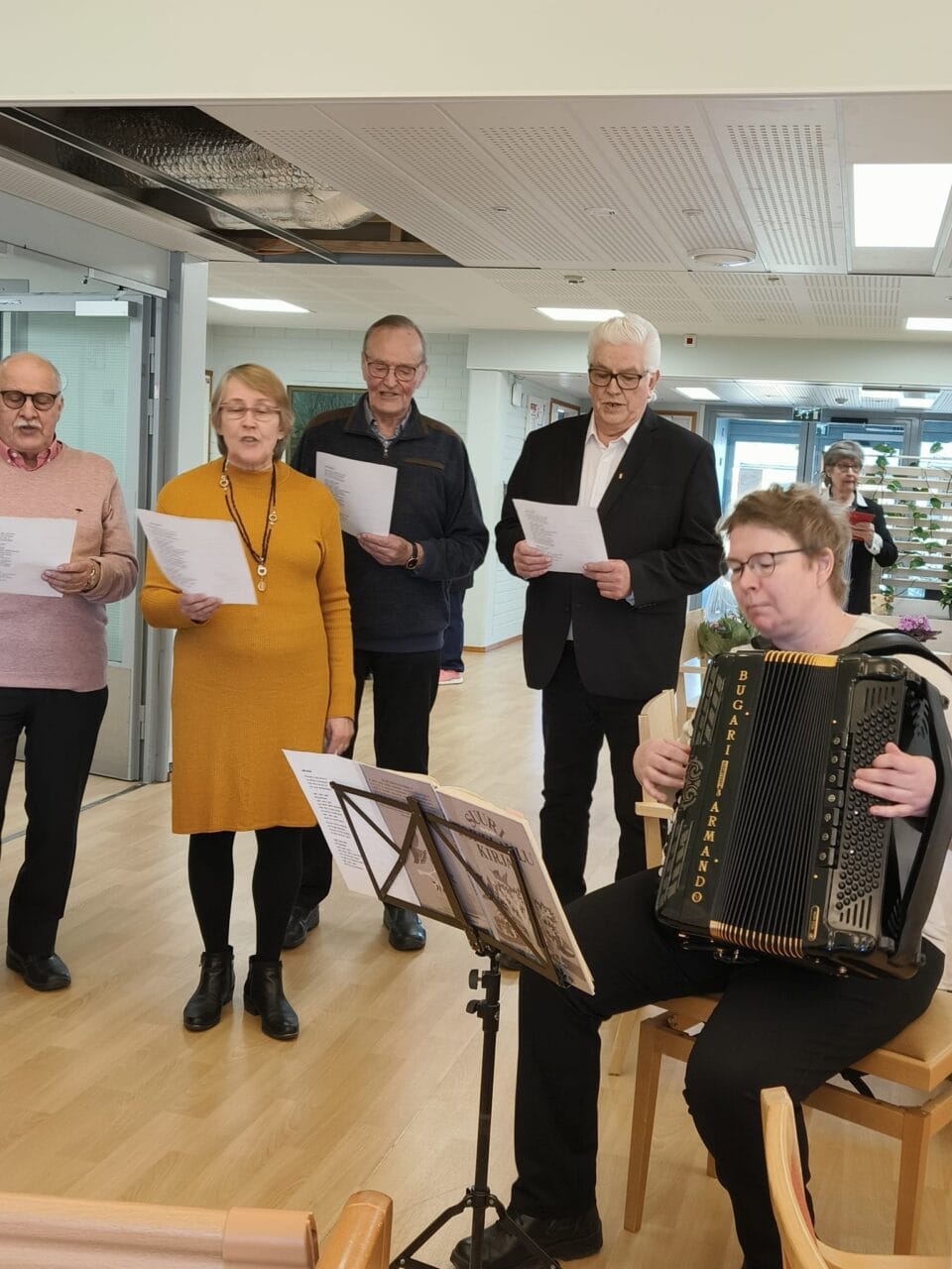 Eläkeliiton lauluryhmä onnittelee 100 vuotta täyttävää Laila Lehtosta Oripään palvelutalolla. Riina Kankare säestää.